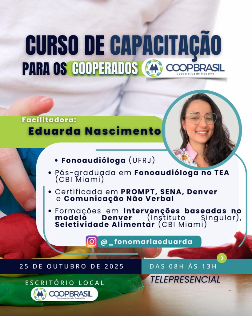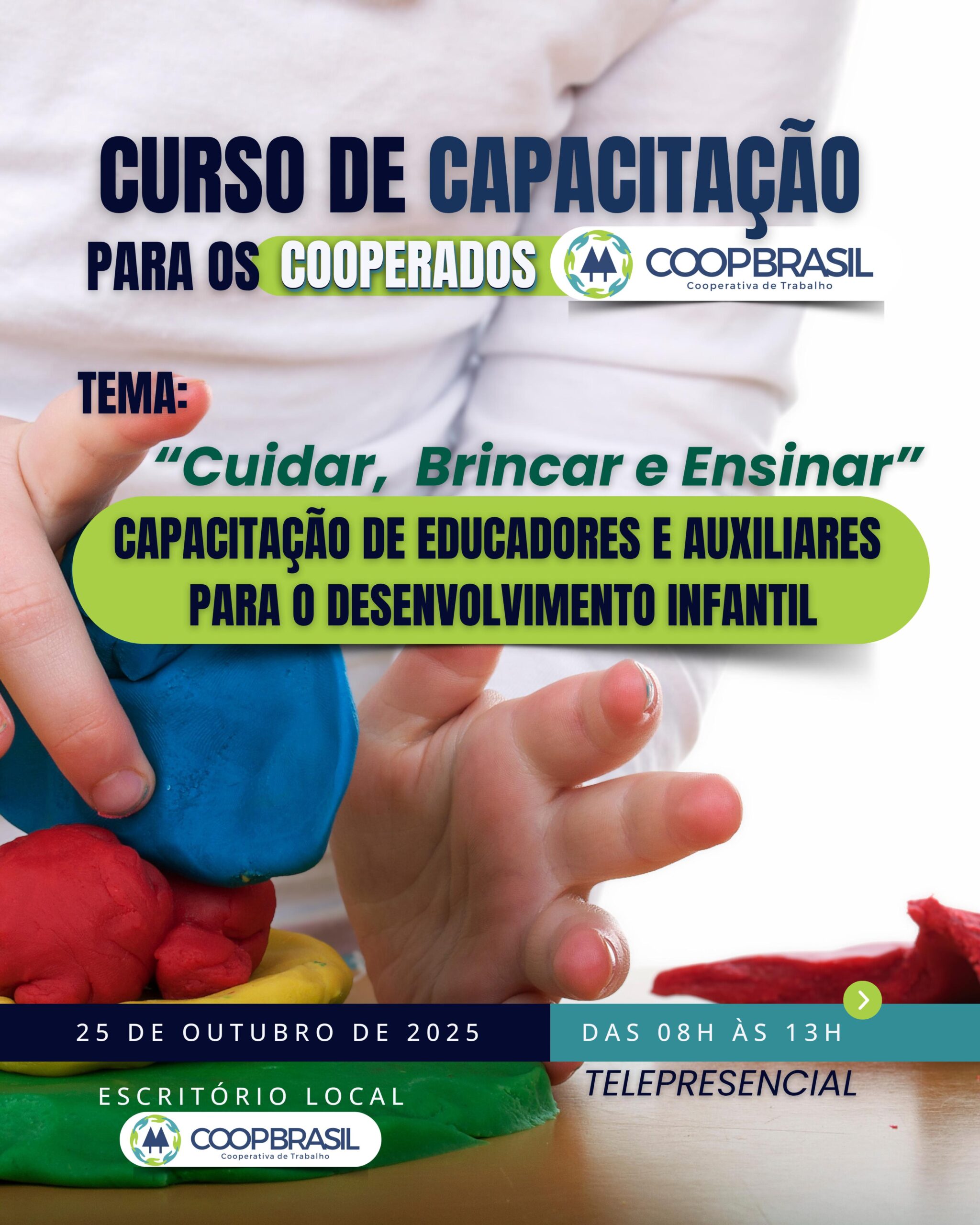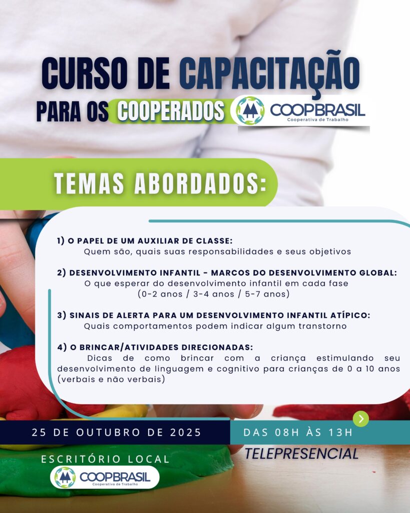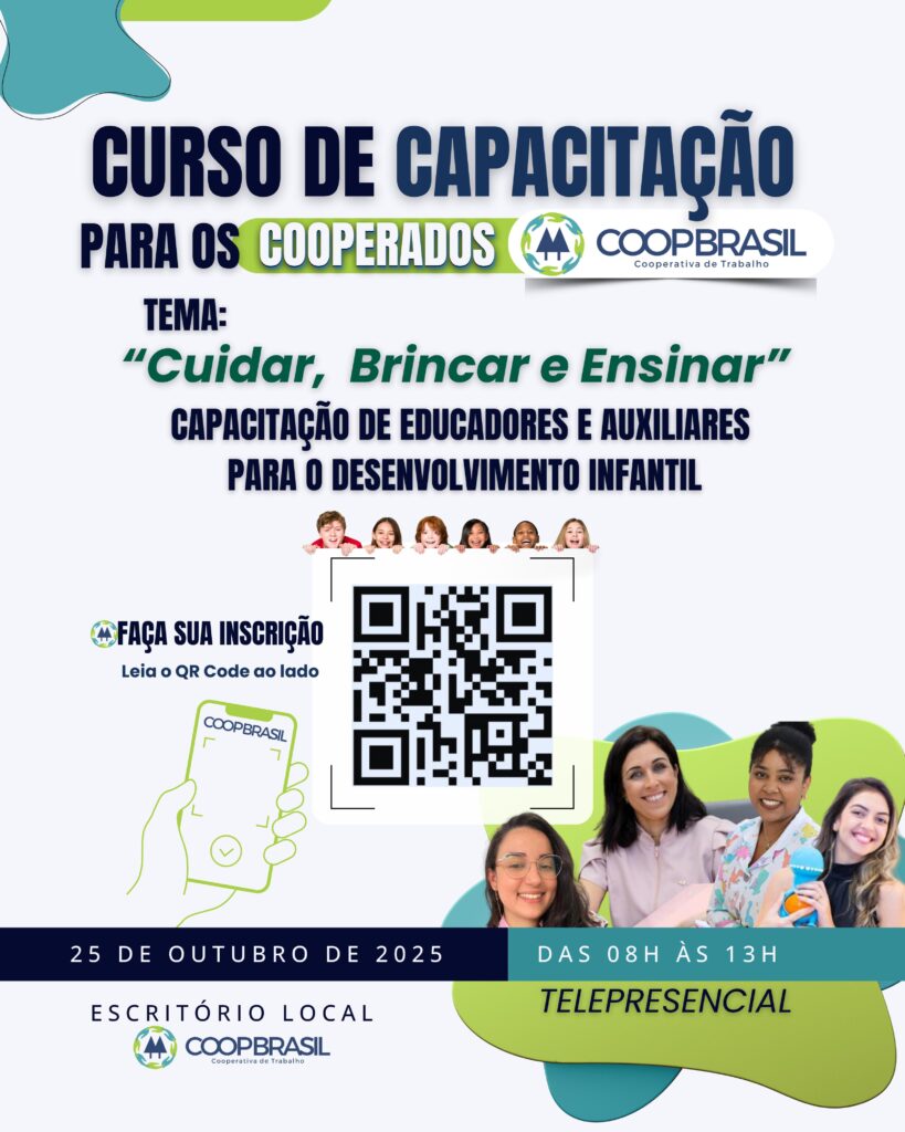 No dia 25 de outubro de 2025 (sábado), das 08h às 13h, acontece o curso “Cuidar, Brincar e Ensinar: Capacitação de Educadores e Auxiliares para o Desenvolvimento Infantil”, realizado de forma telepresencial pela COOPBRASIL.